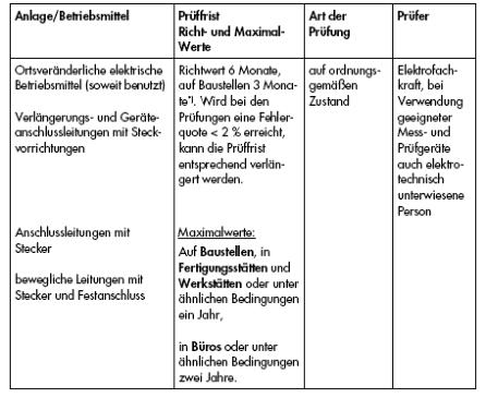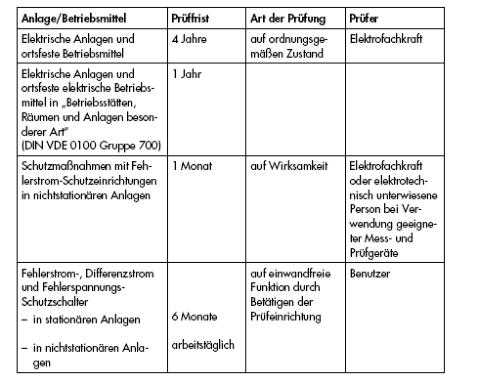 Für ortsfeste elektrische Anlagen und Betriebsmittel sind die Forderungen hinsichtlich Prüffrist und Prüfer erfüllt, wenn die in Tabelle