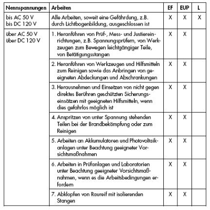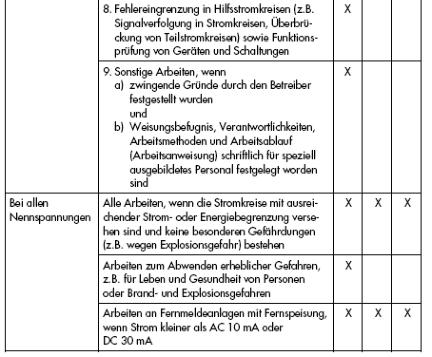 Festlegungen in Tabelle 5 beachtet werden und eine Ausbildung für die unter Spannung durchzuführenden Arbeiten erfolgt ist. Die