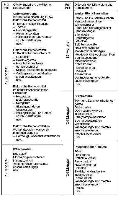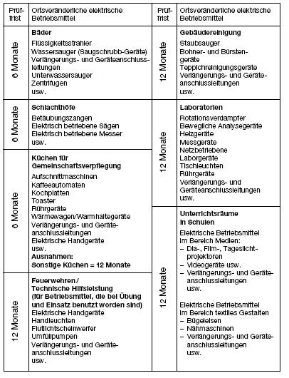 folgenden Tabellen können Prüffristen festgelegt werden, wenn die elektrischen Anlagen und Betriebsmittel normalen